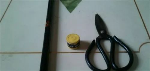 首先先準備工具,剪刀一把,纏繞帶一卷,需要纏繞的魚竿一把,因為手上的竿子都已經纏上了吸汗帶,所以就把竿掛拿出來當做示范的對象。